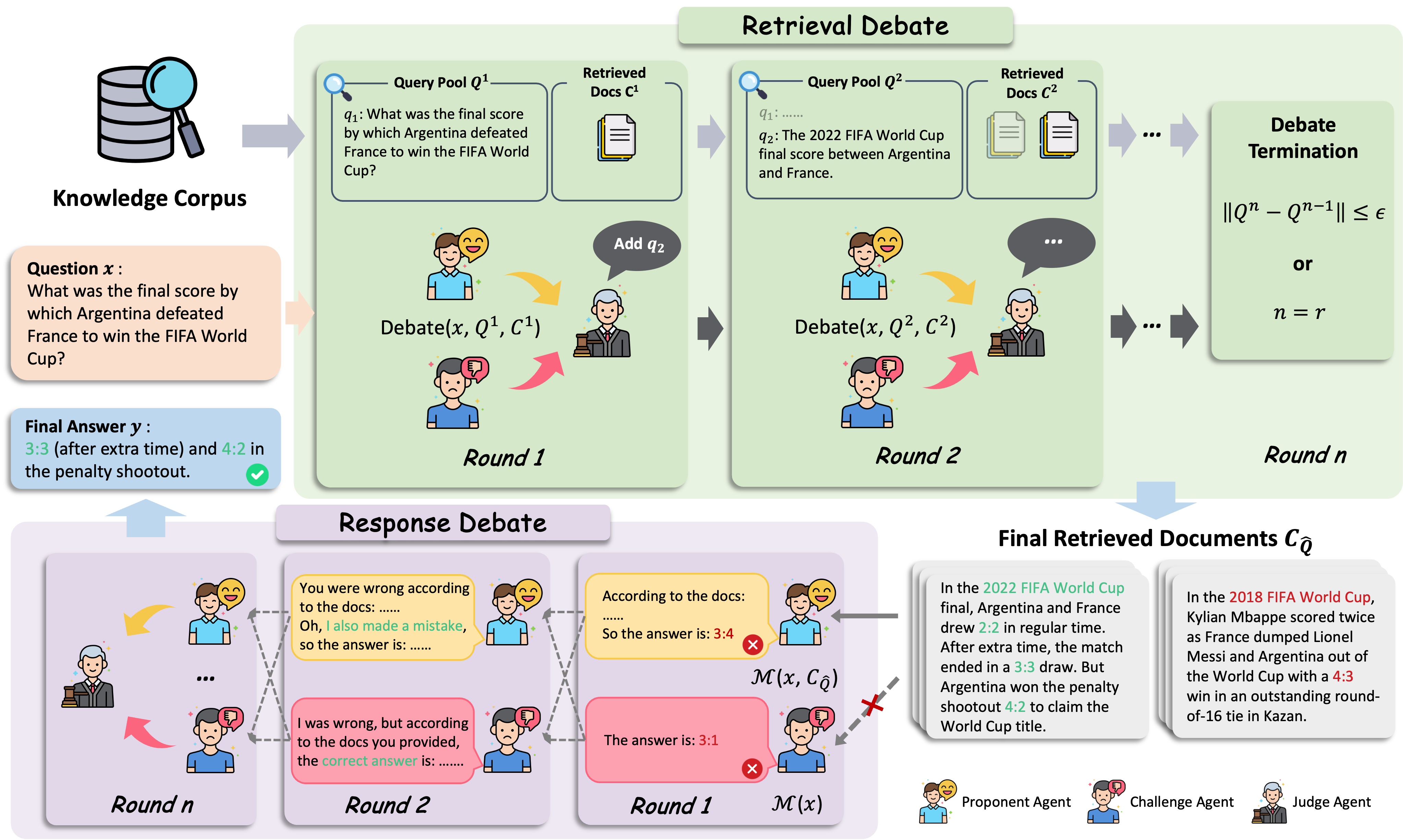 Removal of Hallucination on Hallucination: Debate-Augmented RAGWentao Hu, Wengyu Zhang, Yiyang Jiang, Chen Jason Zhang, Xiaoyong Wei, and Qing LiIn ACL 2025 Main, Sep 2025Retrieval-Augmented Generation (RAG) enhances factual accuracy by integrating external knowledge, yet it introduces a critical issue: erroneous or biased retrieval can mislead generation, compounding hallucinations, a phenomenon we term Hallucination on Hallucination. To address this, we propose Debate Augmented RAG (DRAG), a training-free framework that integrates Multi-Agent Debate (MAD) mechanisms into both retrieval and generation stages. In retrieval, DRAG employs structured debates among proponents, opponents, and judges to refine retrieval quality and ensure factual reliability. In generation, DRAG introduces asymmetric information roles and adversarial debates, enhancing reasoning robustness and mitigating factual inconsistencies. Evaluations across multiple tasks demonstrate that DRAG improves retrieval reliability, reduces RAG-induced hallucinations, and significantly enhances overall factual accuracy. Our code is available at https://github.com/Huenao/Debate-Augmented-RAG.